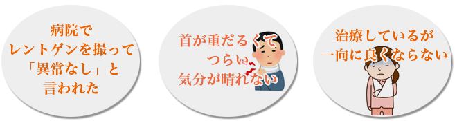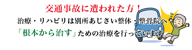 交通事故は、ほんの小さな衝撃であっても、予測できずに身体に負荷がかかるため、大きなダメージを受けてしまいます。交通事故にあわれたら、まずは病院に行かれる方がほとんどですが、むち打ち症状など病院では改善しない場合もあります。レントゲンで異常がないからといってそのままにしていると、重だるさや違和感が続き、後から痛みが出てくることもあります。病院でもらう湿布や痛み止めでは、その場で痛みを消しているだけで根本改善にはなりません。あと数ヵ月後、数年後・・・後々の後遺症とならないために、今しっかり施術を受けることが大切です。